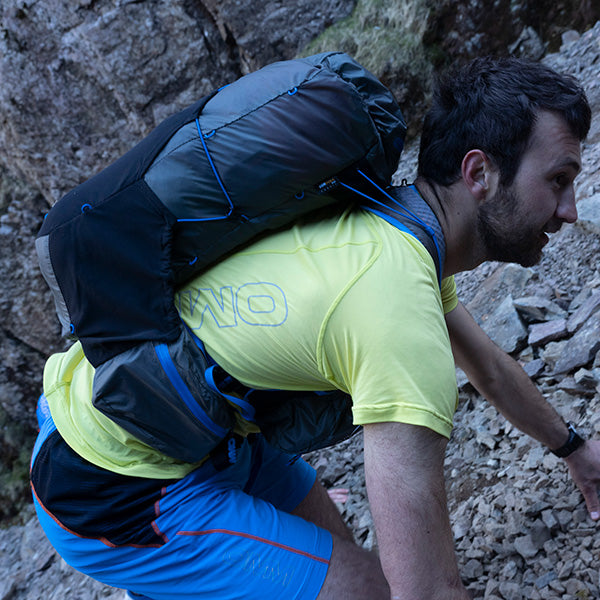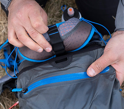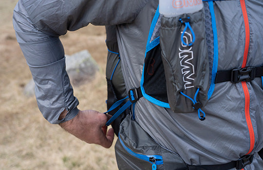 山岳レースに代表されるファストパッキングスタイル登山のために開発されたPhantomシリーズ。最大の特徴は7つの支点でパックの揺れを抑える独自のハーネスシステムです。首の後のY字型ハーネスがパックの重心を身体の中心=背骨に固定し、肩周りの動きを妨げないため、より自然なランニングフォームを可能にします。どんな悪路でも両脇のV字アンカーが背中にピッタリとパックを密着させ、横揺れも縦揺れも抑えます。