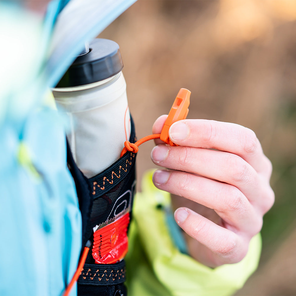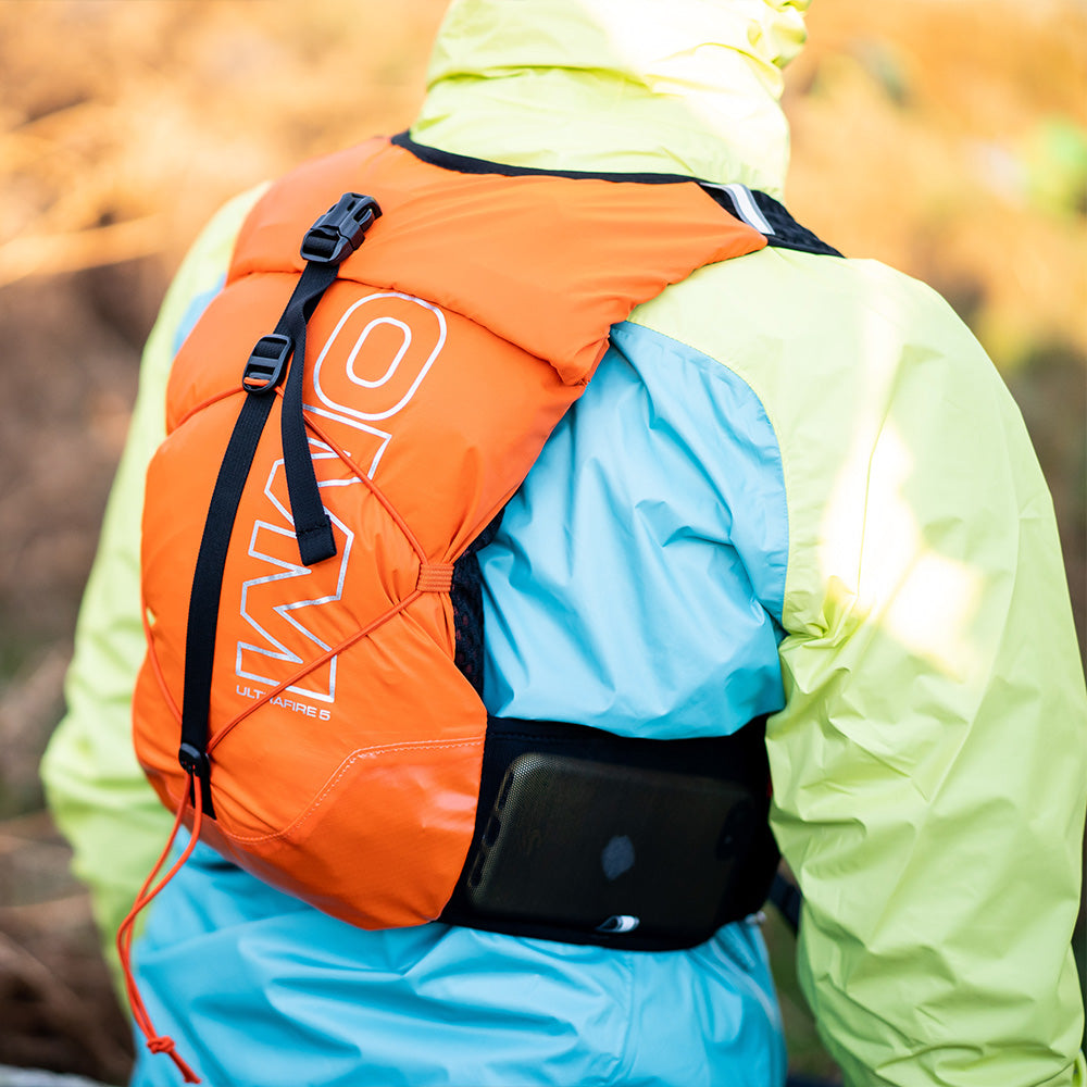UltraFire Vestは、ランニング中に必要なものをすべて収納できるポケットを手の届く範囲に7箇所備え、さらに5リットルのロールトップ式の耐水背面ポケットも配置しました。寒い日には予備のドライキットなどを携帯できます。UltraFireは人間工学に基づき、肩と横隔膜でホールドするように設計しました。肺を開放することで最適なパフォーマンスを実現します。TrailFire Vestのように行動中に必要なものは前面ポケットに、使用頻度の低いアイテムはUltraFireの5L背面ロールトップ式バッグのなかに収納しましょう。